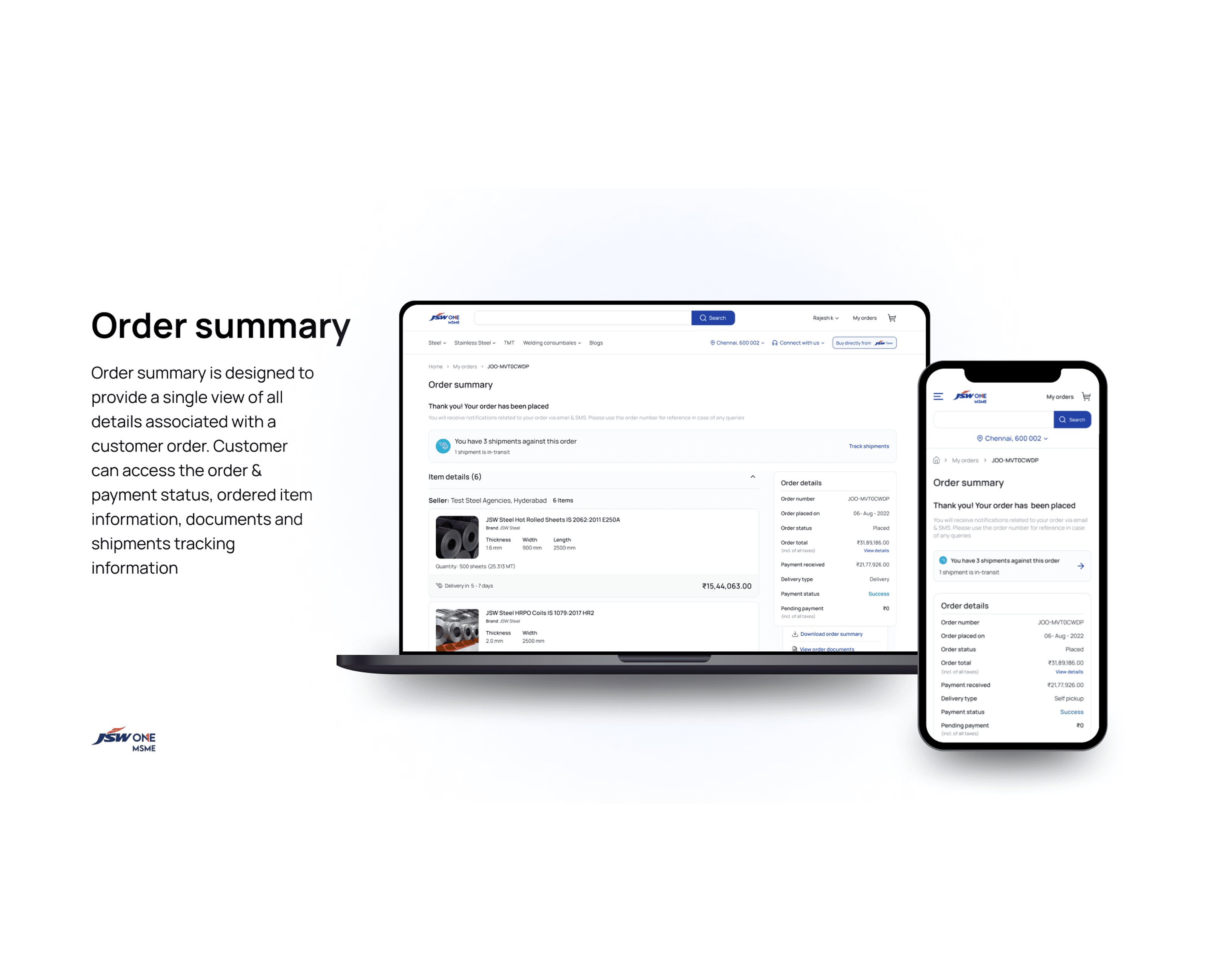 JSW One is a B2B e-commerce platform for steel and construction materials, built for MSMEs, small and medium businesses that procure large volumes of industrial goods. These aren't casual shoppers. They're procurement managers, site engineers, and business owners who deal with multi-SKU orders, ledger balances, advance payments, freight charges, and compliance documentation every day.