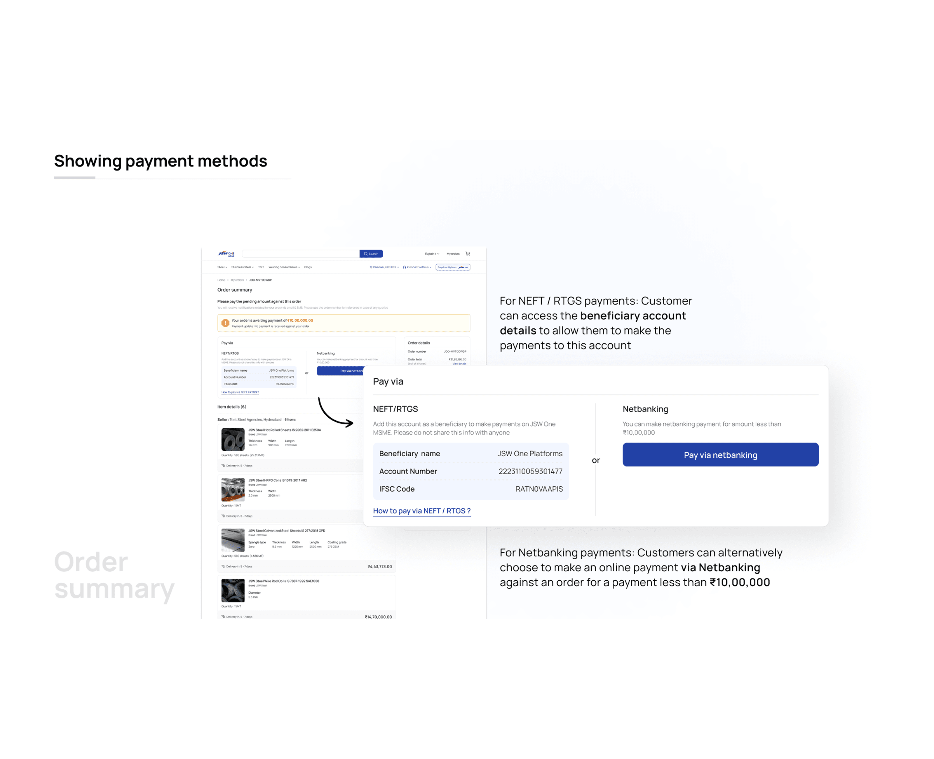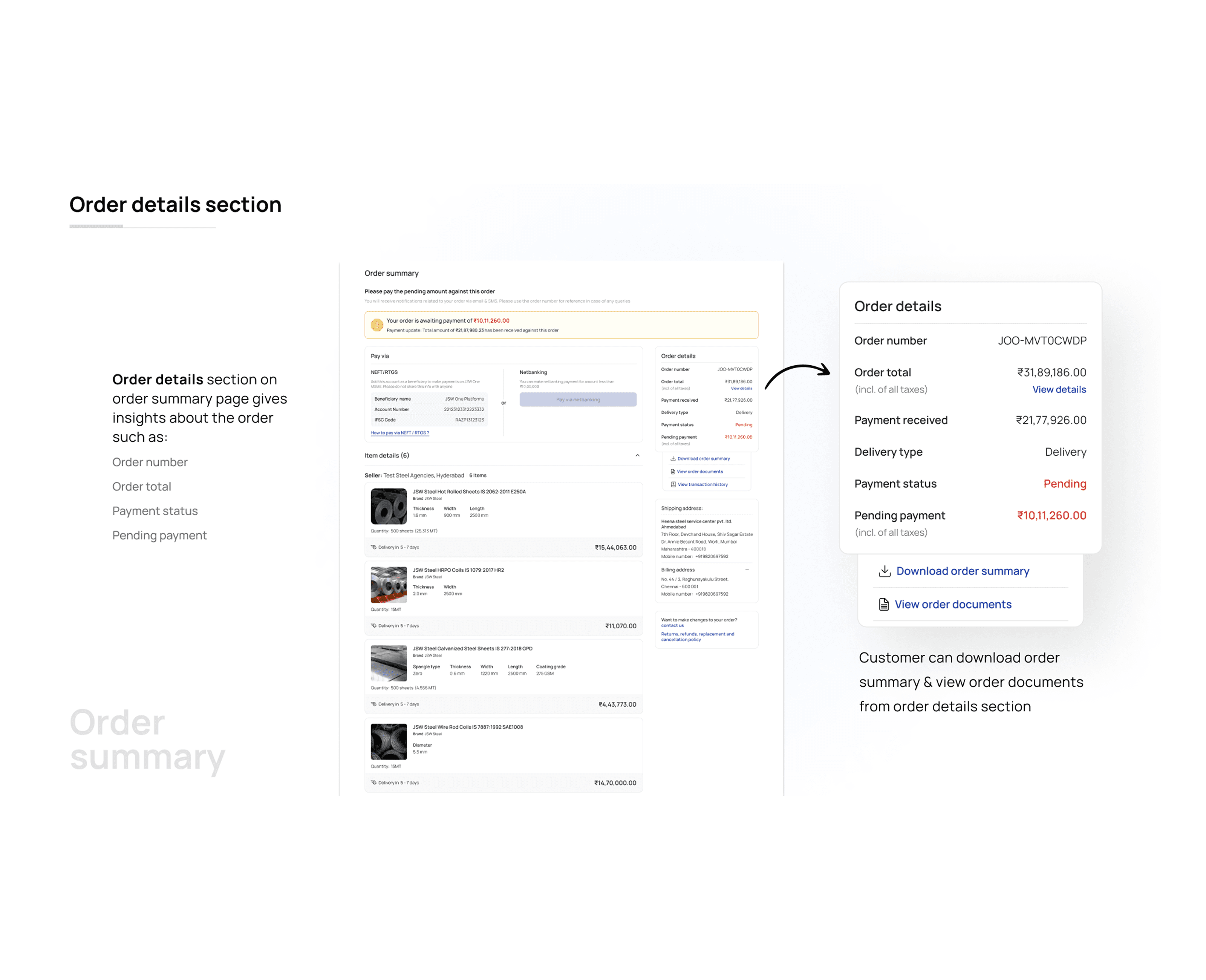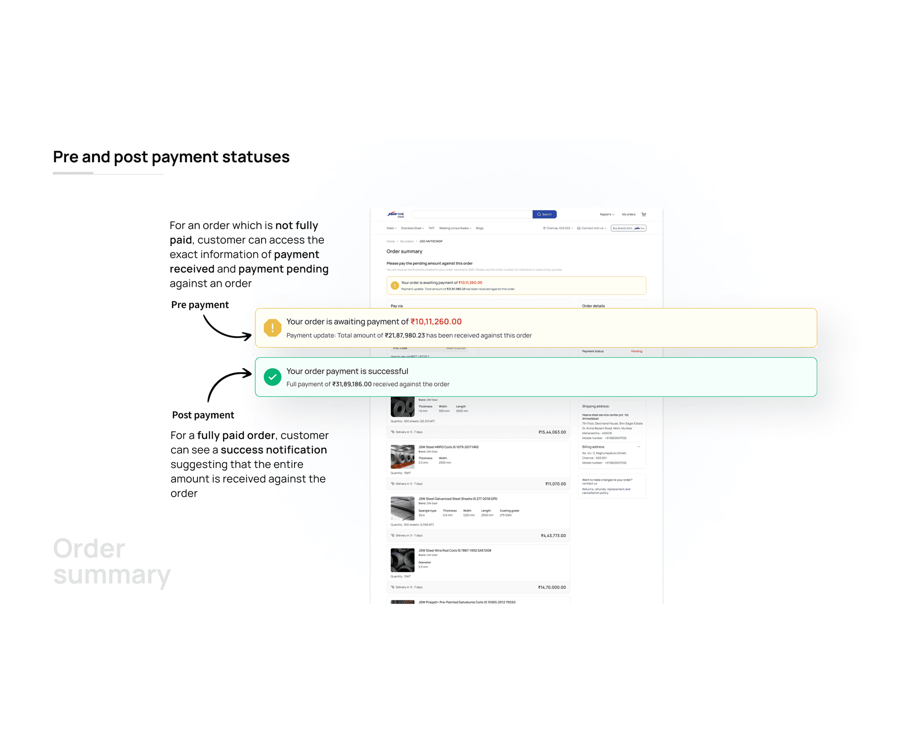 The checkout flow didn't reflect any of that. Click "place order," land on a payment page, make a decision about money with almost no information visible. For a consumer buying a โน500 product that's fine. For an MSME committing to a โน5 lakh steel order, it isn't.