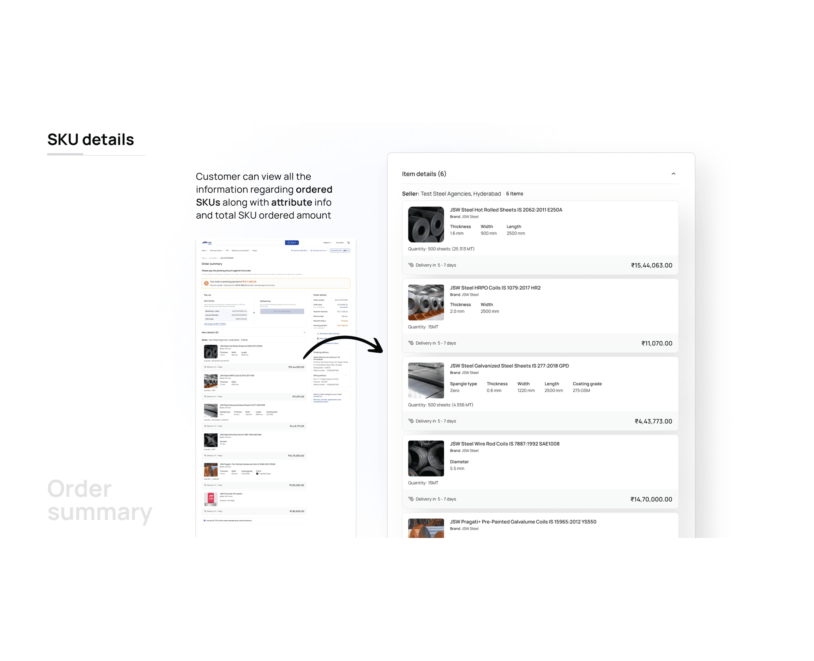 This shows product variant, quantity, per-unit price, total ordered price, and estimated delivery timeline per line item. For multi-SKU orders, this becomes a ledger in itself. The section is designed so a site manager can read it and know exactly what to expect, without needing to call anyone.