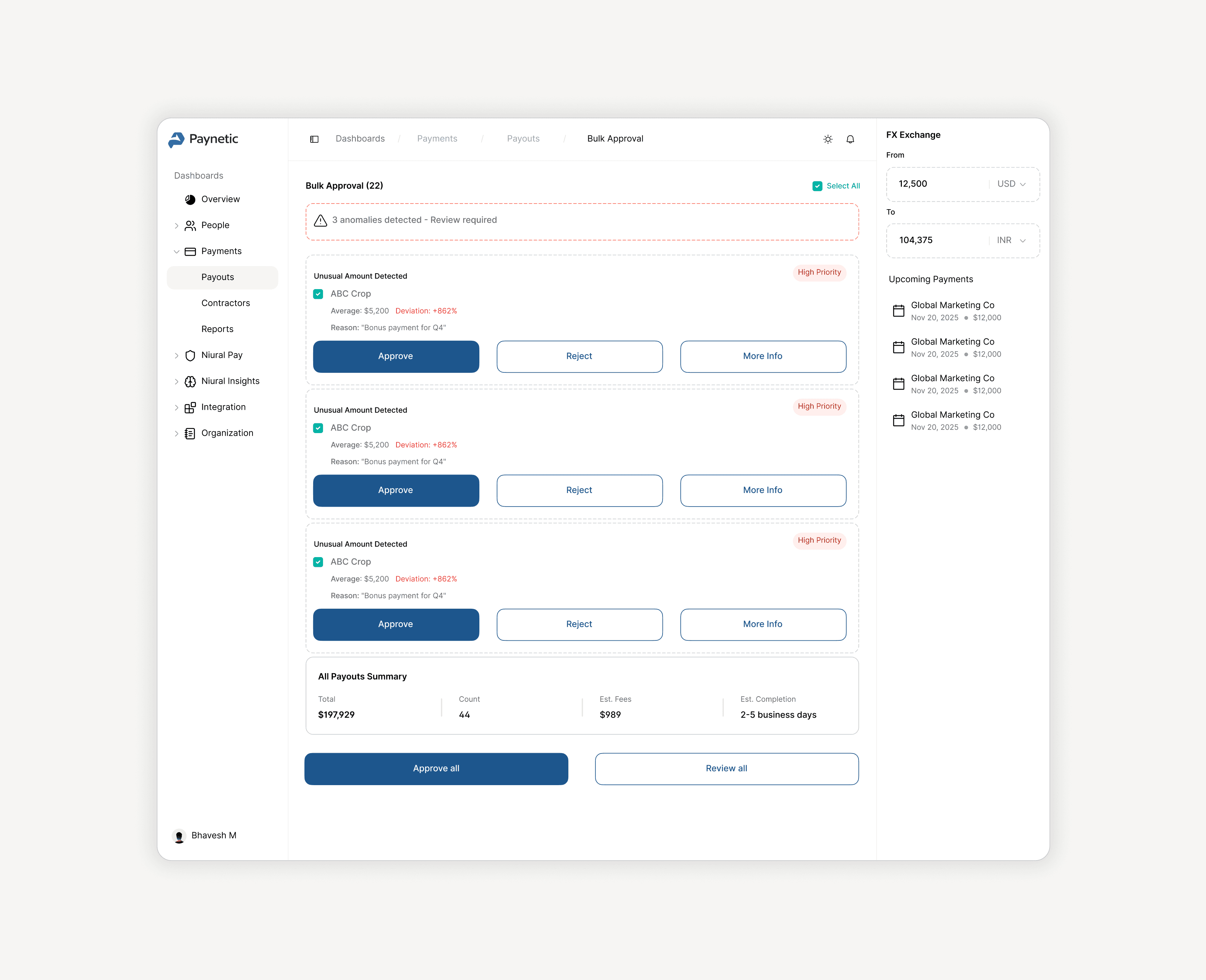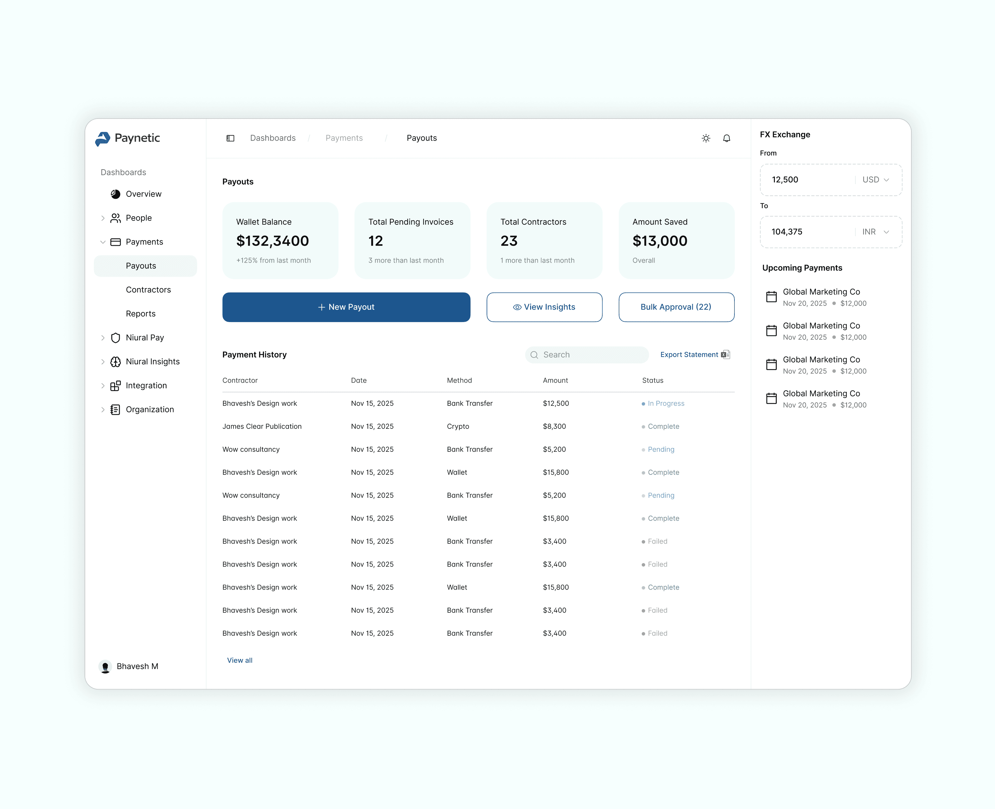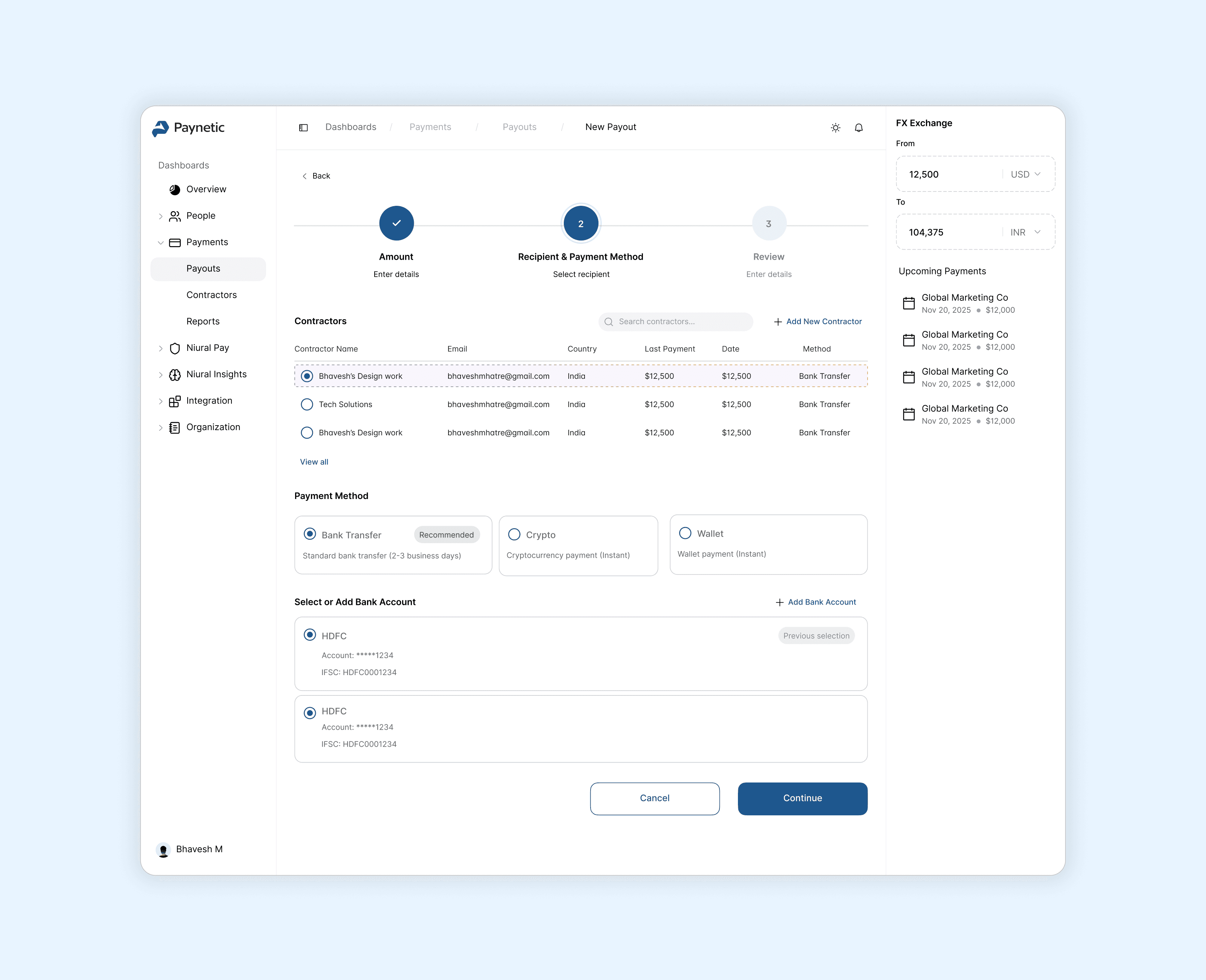 The contractor list scales to 500+ contractors. Each card shows last payment amount, date, preferred method, country, and a risk indicator, the information that prevents the most common payment error, which is selecting the wrong contractor. That error rate is around 12% on manual systems. The card design gets it under 1%.