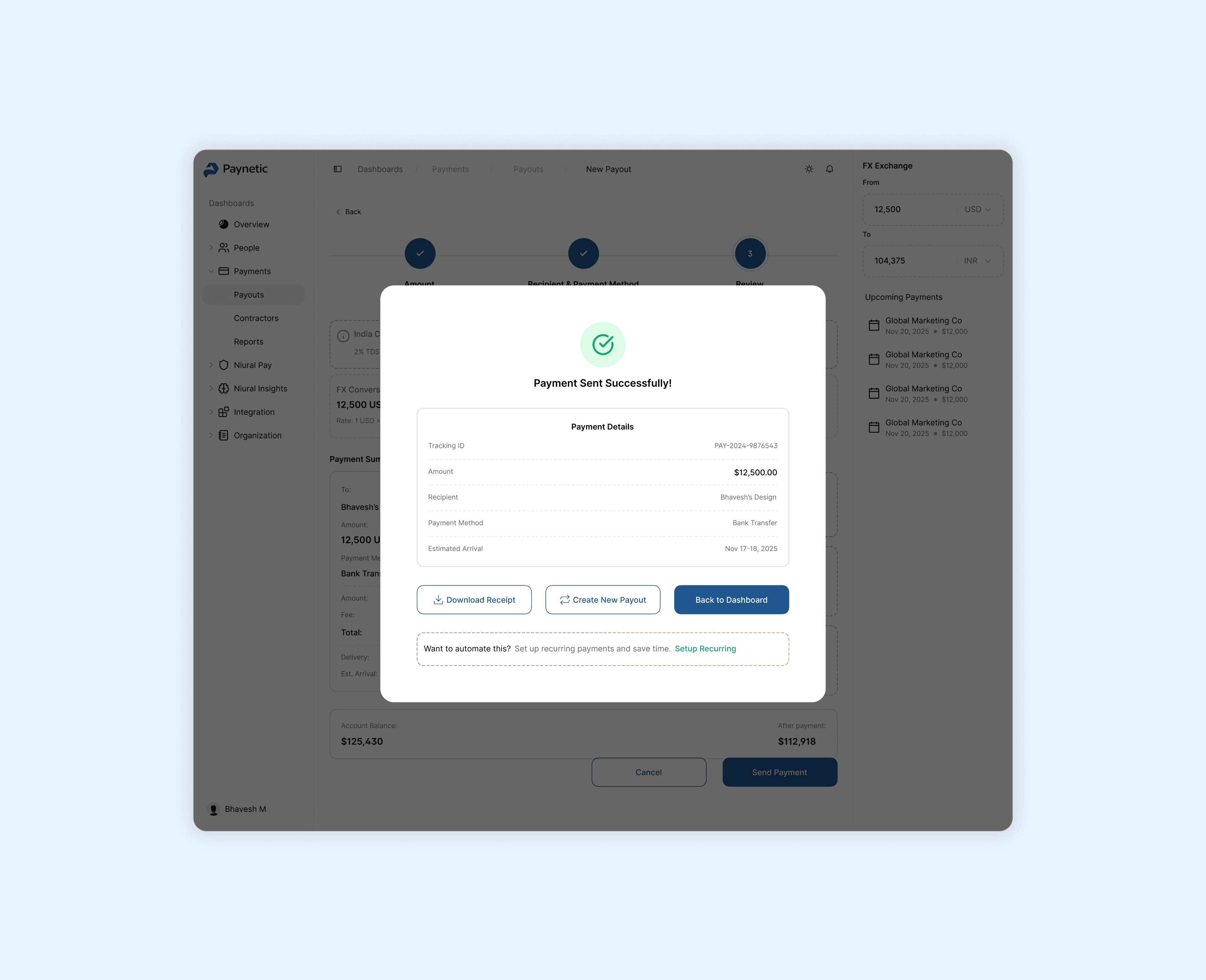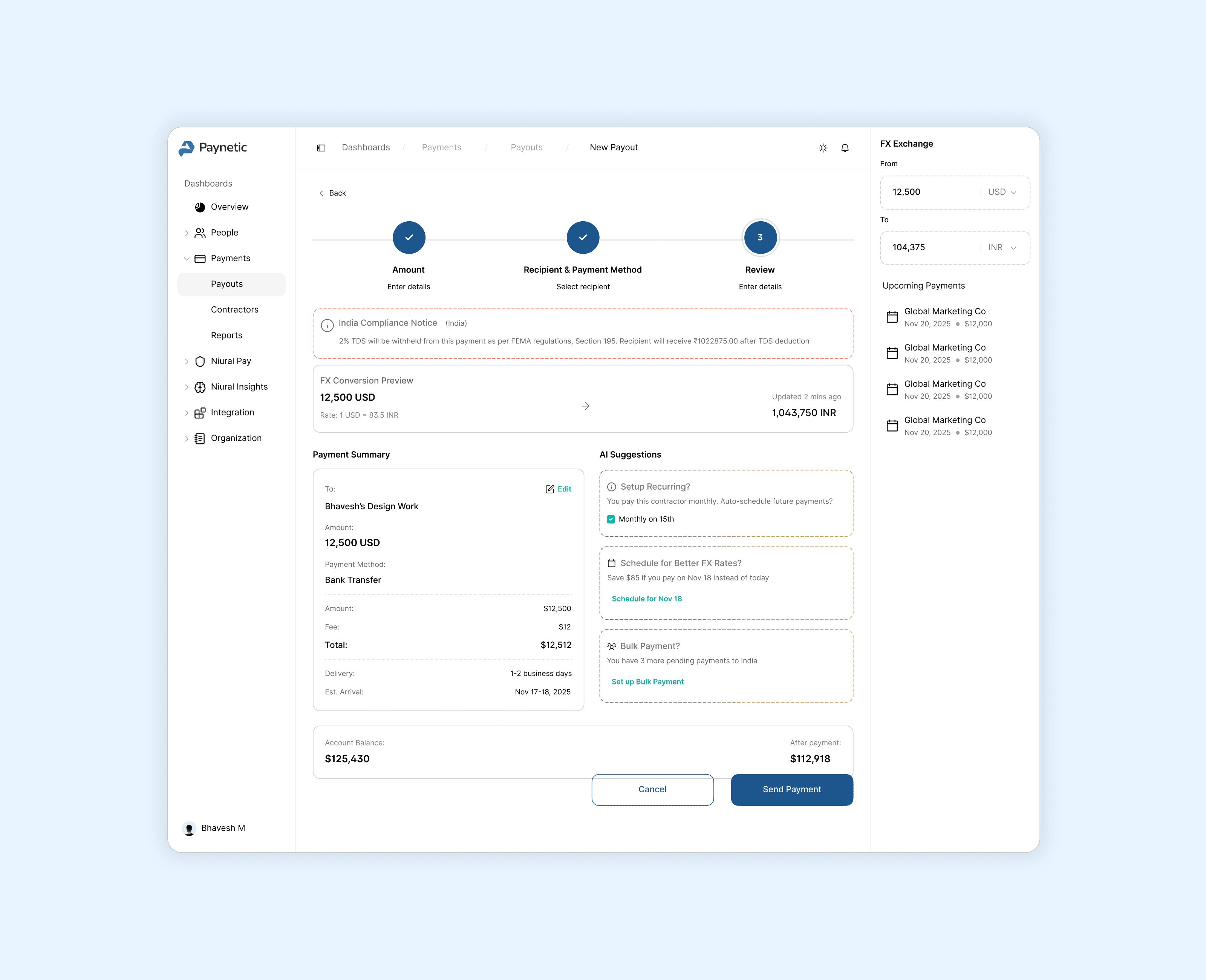 The compliance banner sits at the top of the review screen not buried in fine print. For an India payment, it surfaces the TDS withholding notice with the exact amount and the relevant FEMA regulation. Contractors getting less than they expected is a support problem and a trust problem. Surfacing it proactively before the payment goes out is cheaper than explaining it afterward.