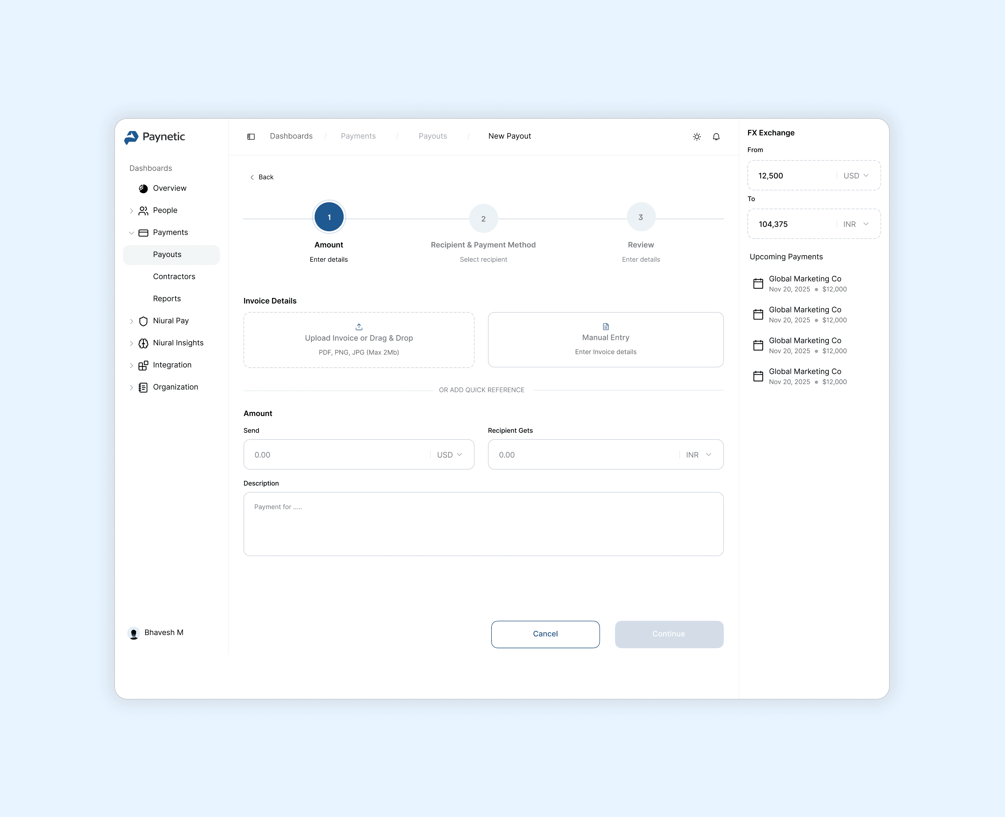 The dual entry path upload or manual, wasn't an afterthought. Around 80% of payments start with an invoice upload. The other 20% are recurring payments a finance manager could do from memory. Forcing that 20% through an upload flow is friction for no reason.