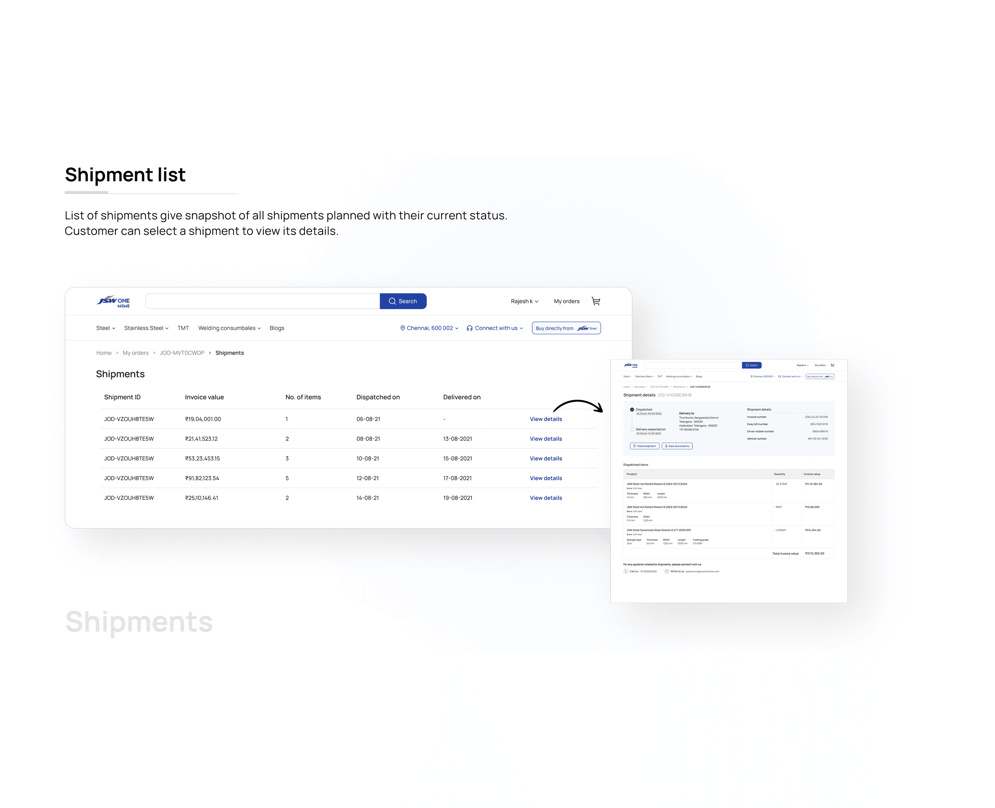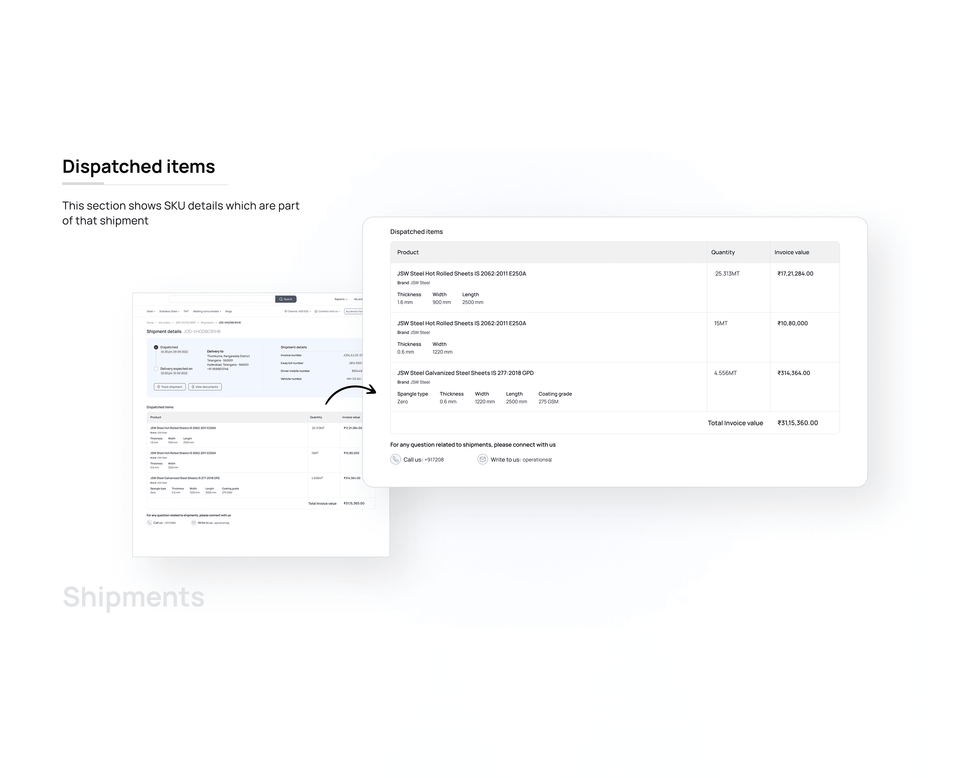 Before this, none of it was visible in the product. Buyers found out through phone calls, either JSW operations calling them, or them calling JSW to ask where their material was. The ops team was spending a significant chunk of each day answering questions that should have had self-serve answers.