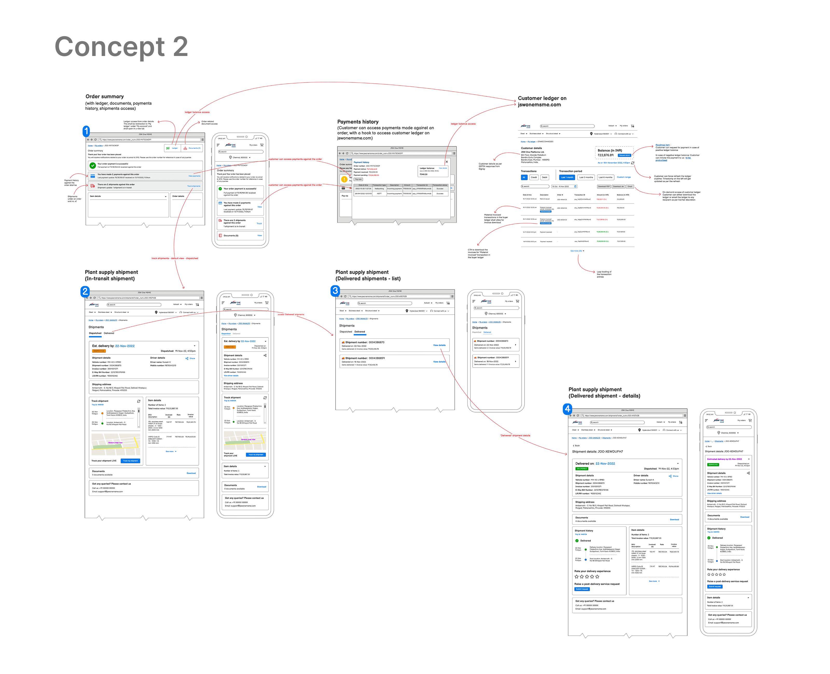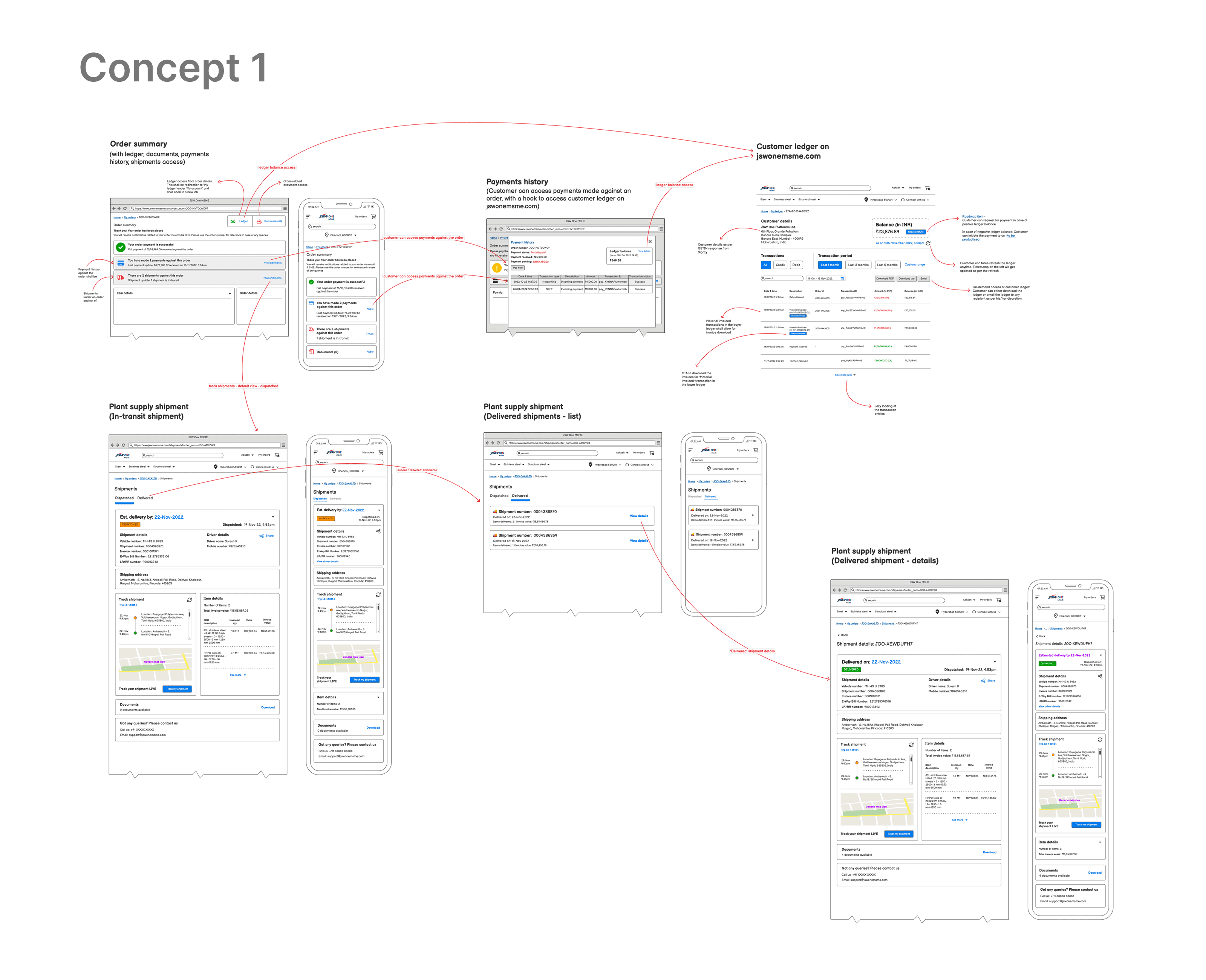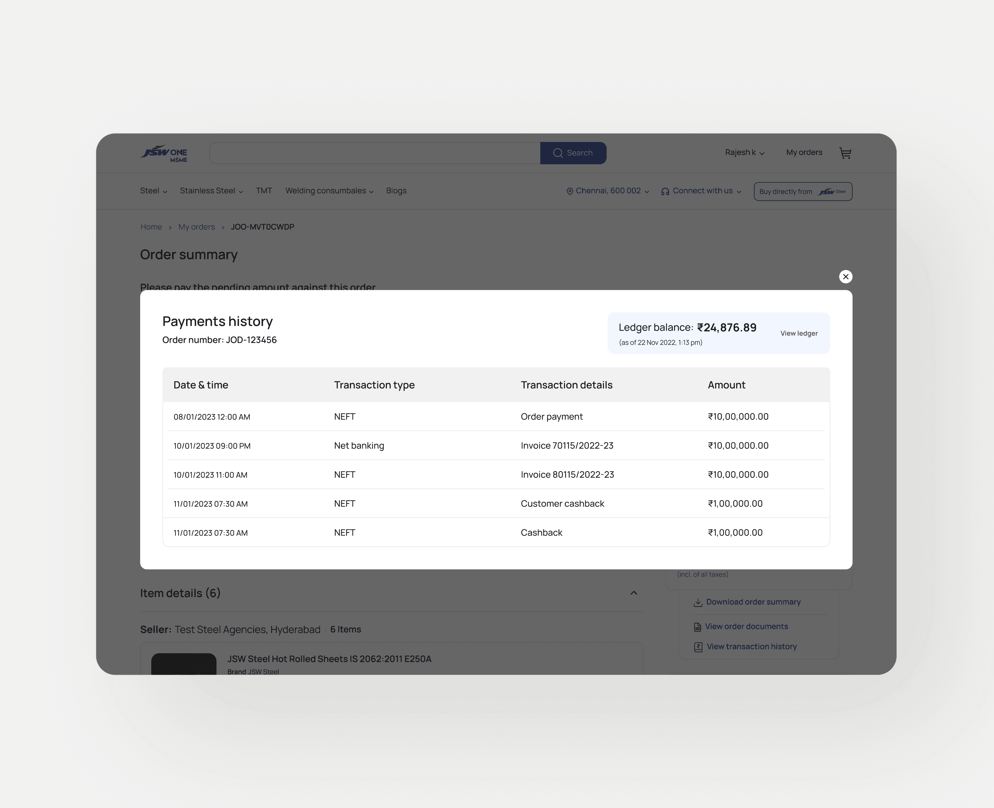 Beyond shipments, the order summary also needed to surface payment history and connect to the customer ledger on jswonesmsme.com. Customers could see payments made against the order and access their ledger balance with a direct hook to the MSME portal.