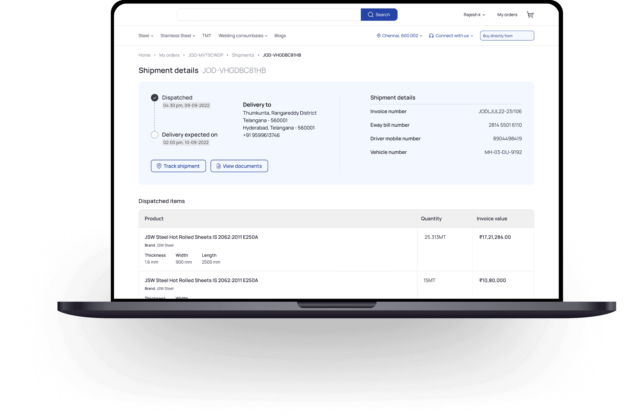 Steel orders are complex, multiple SKU types (hot rolled, galvanized, TMT), different thicknesses, widths, quantities, and invoice values per line item. Buyers need this to verify what was actually shipped against what they ordered.