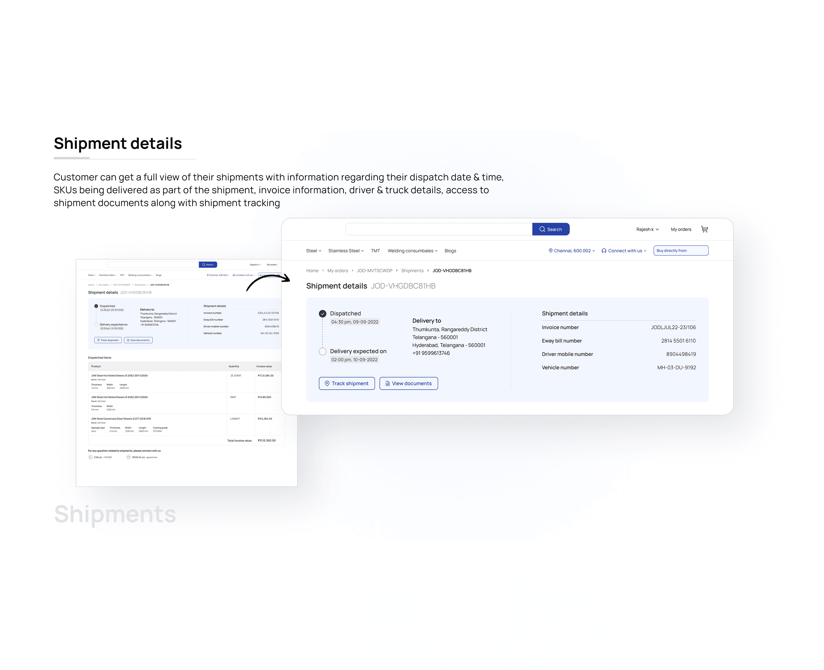 The detail page is where the real work happens. A customer managing a large steel delivery needs the driver's phone number, the truck's vehicle number, and the eway bill all at the same time, often while standing at a construction site on a phone.